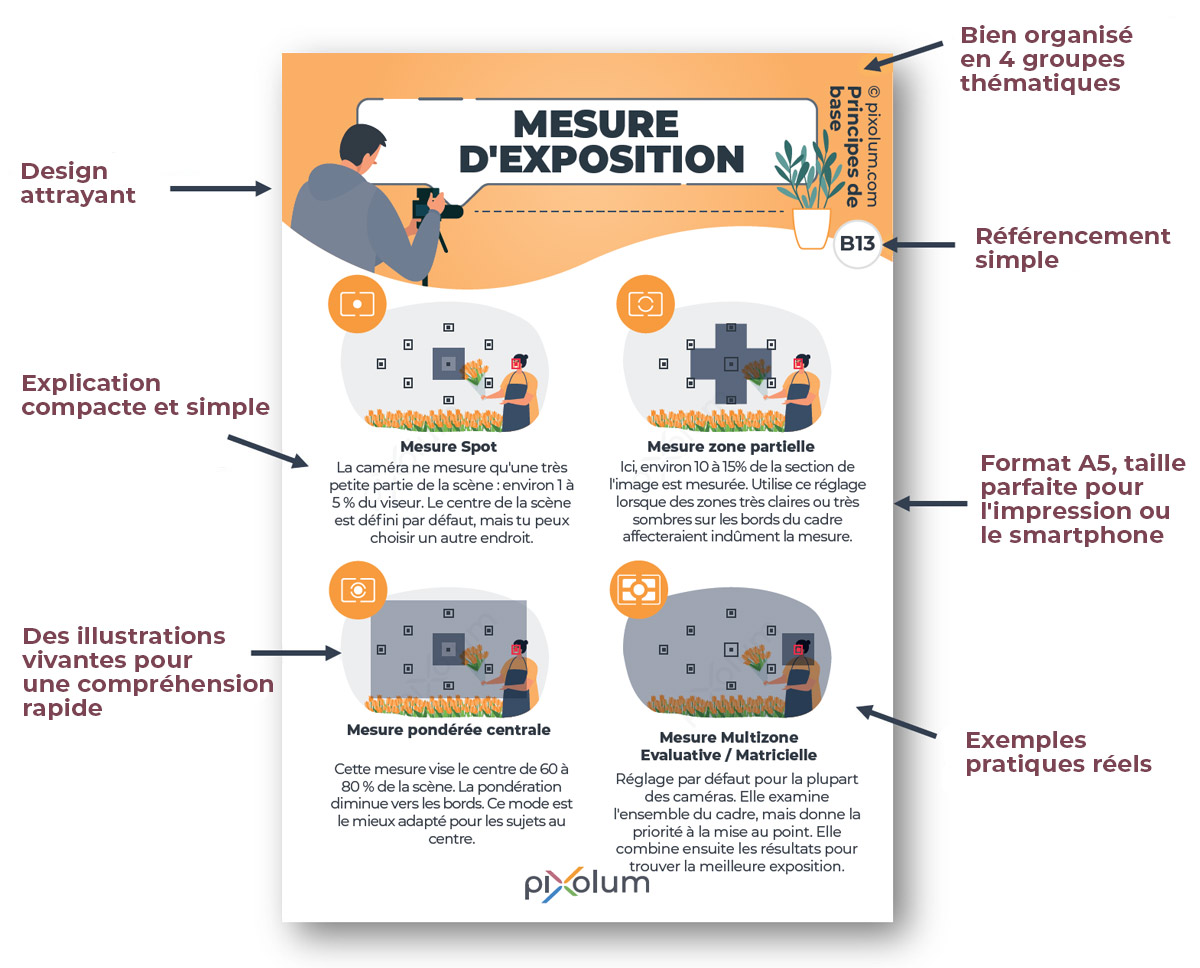 Sur ces fiches, l'information est présentée de manière claire, avec des illustrations, schémas et infographies explicatifs qui en facilitent la lecture. Disponibles au format numérique (en PDF), ces fiches peuvent bien entendues être imprimées en format A5 pour être emportées partout avec vous, selon le sujet que vous allez photographier par exemple.