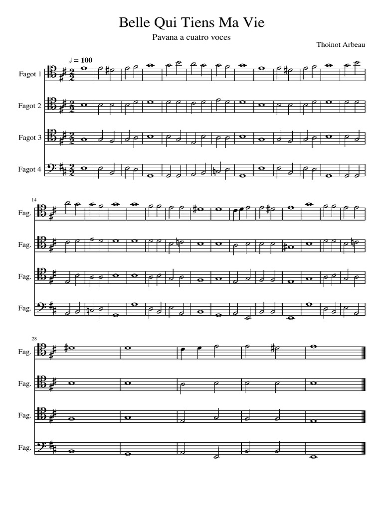 Belle qui tiens ma vie Pavane à quatre parties Thoinot Arbeau (Jehan Tabourot), 1520 - 1595 de l'Orchésographie, 1589 Bel vi æ æ e qui ´ tiens ma le tes æ yeulx, ti ue dans cap èè èè rire ve gra dans sou ti ci tes eux, yeux, l'â qui me tiens 1.; qui Bel m'as le, e e d'un cap ra ma vi vi dra mou fau rir, me viens tôt me ou.