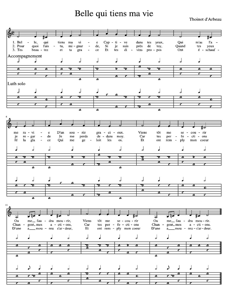 Paroles de Belle qui tiens ma vie Paroles tirées de l'Orchésographie ( 1589 ) de Jehan Tabourot (1520-1595), dit Thoinot Arbeau . Ces paroles sont attribuées au roi François Ier , cette musique est à l'origine un choral religieux.