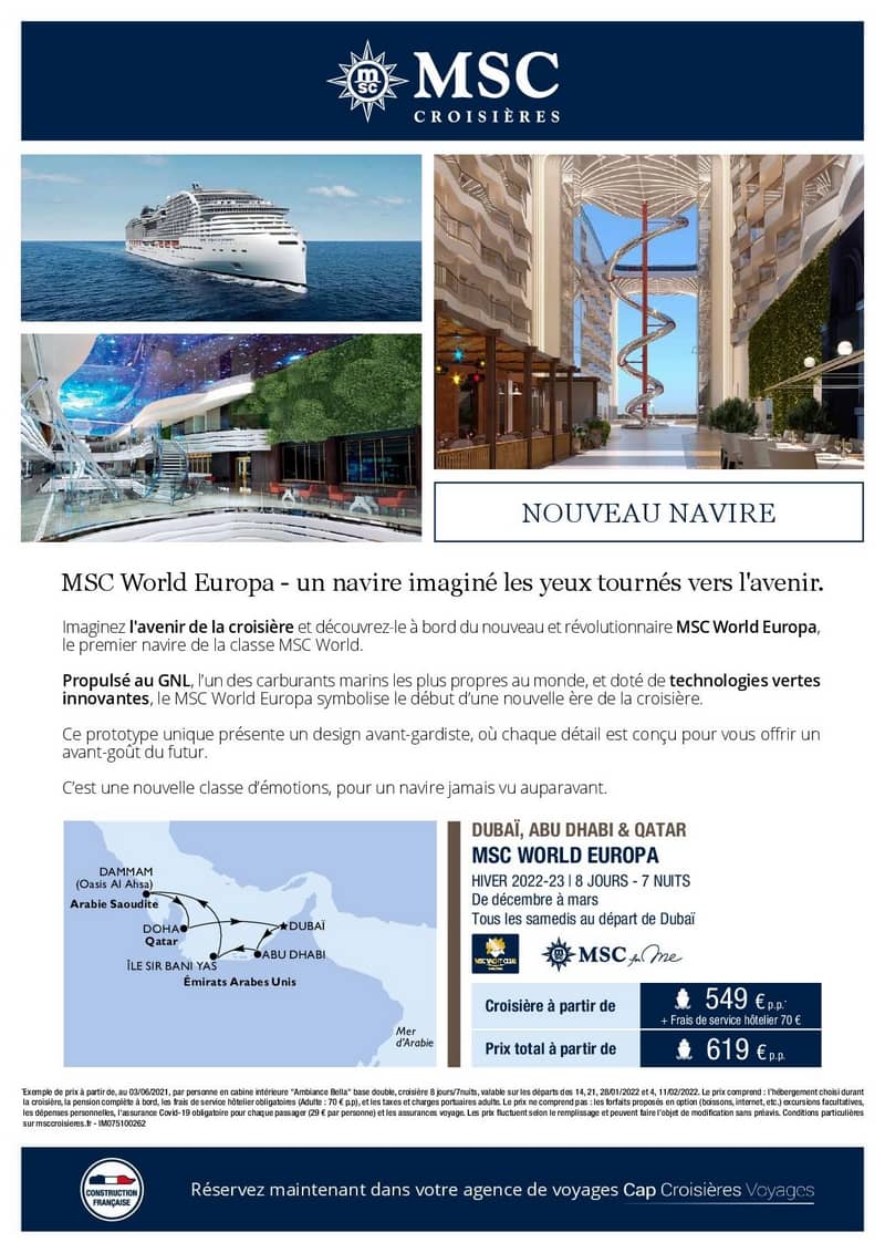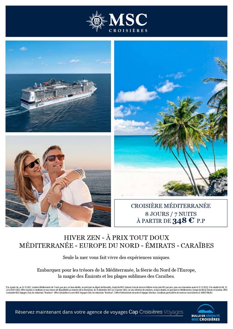 Nos meilleures offres et promotions de croisières 2024-2025 vers des destinations telles que la Méditerranée, les Caraïbes, les Antilles, l'Europe du Nord et les Émirats Arabes Unis sont à votre portée. Vous souhaitez embarquer en France ? Profitez de nos croisières au départ de Marseilles, de Cannes ou du Havre.Ne manquez pas nos offres de croisières avec notre forfait MSC Vols.