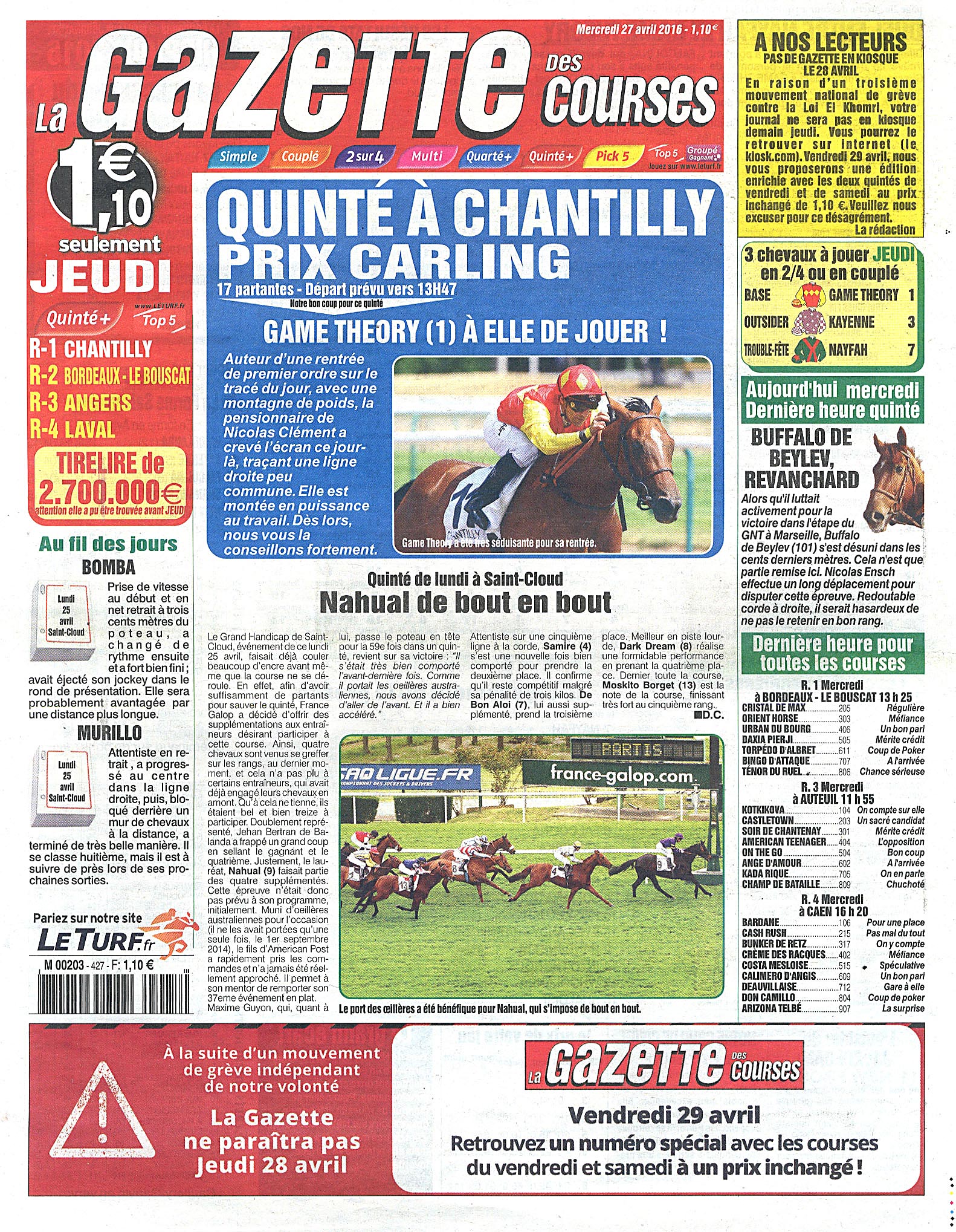 Acheter le journal;. La Gazette des Courses. Retour Quinté. Acheter le journal; S'abonner au journal; Les dernières actualités du Quinté + Quinté du jour. Retour Quinté Quarté pour la Synthèse. Royaumont s'est imposé de justesse avec Cristian Demuro ce lundi 22 avril dans le Handicap de Bordeaux, Quinté+ du jour sur l.