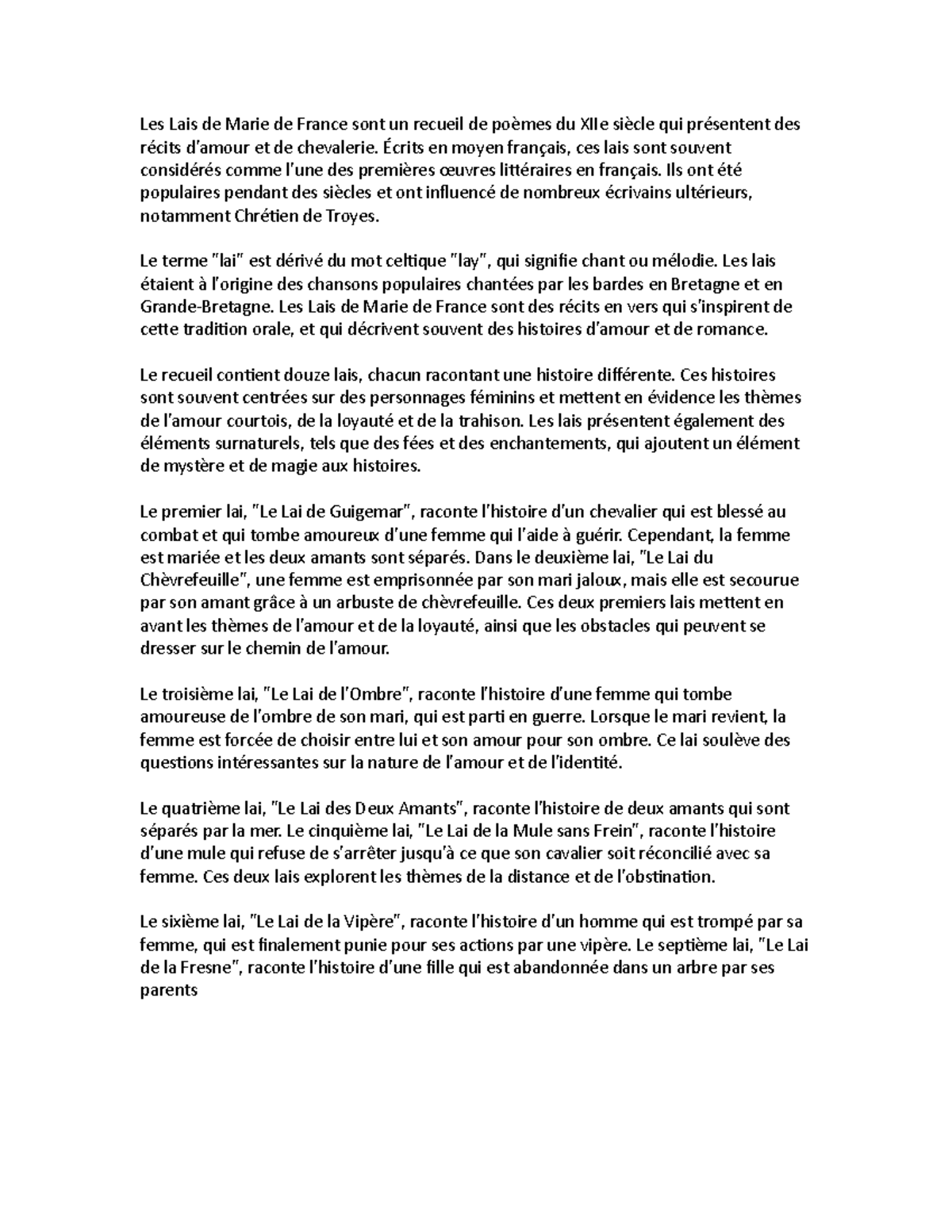 Lais Bref résumé du livre Lais Les Lais de Marie de France sont un recueil de poèmes du