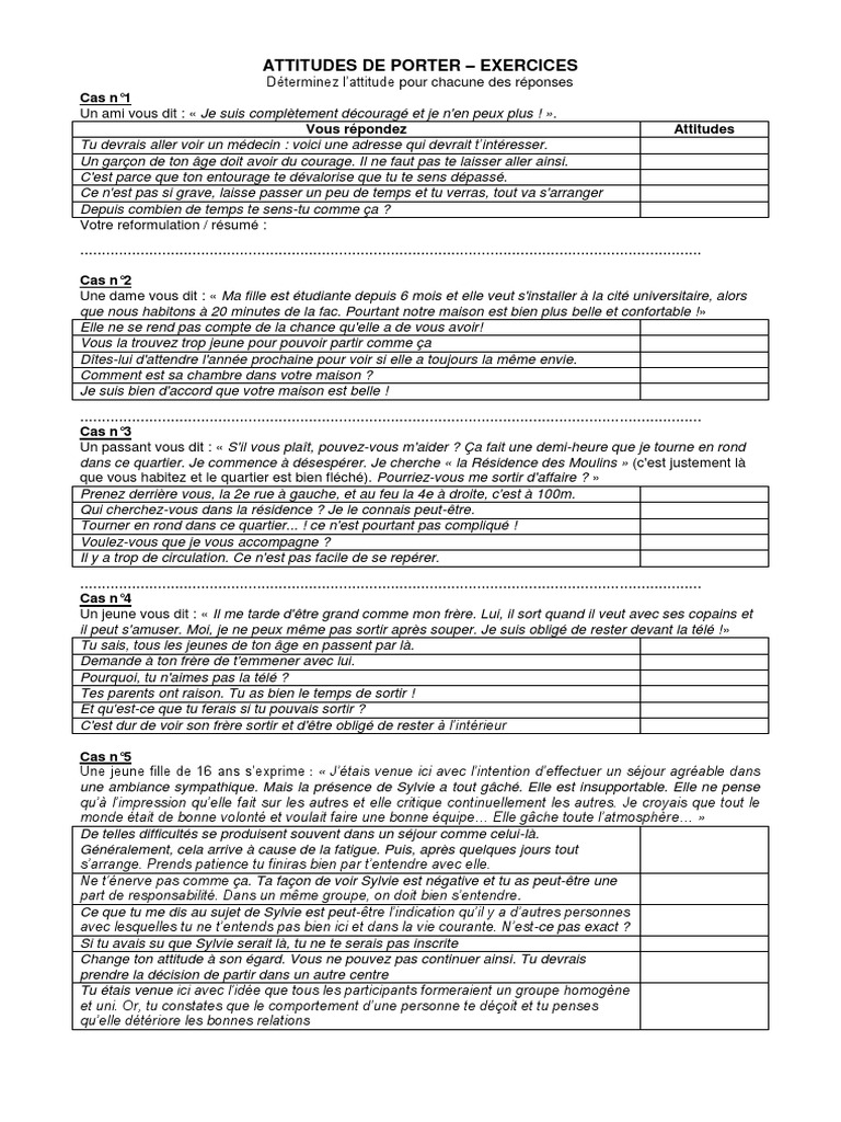 avez. une. attitude. spontanée. prédominante ou des attitudes constantes. L'exercice est tiré des travaux d'Elias PORTER, de. « L'entretien de face à face dans la relation d'Aide », et. adapté par le cabinet de formation Astrée. Lisez les 10 situations qui suivent et entourez la réponse qui.