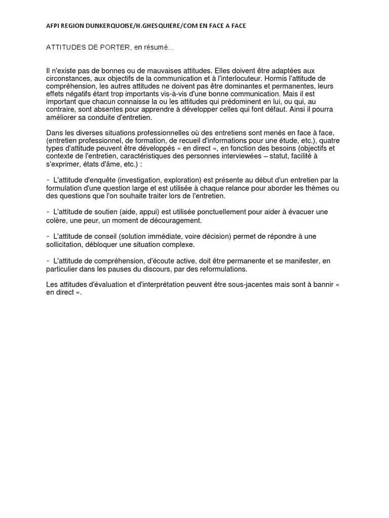 LES 6 ATTITUDES SPONTANEES DANS LA COMMUNICATION, décrites par Elias H. PORTER. ATTITUDES. DESCRIPTION. Effets produits + (Interlocuteur) Effets produits -. (Interlocuteur) Attitude directive (Suggestion/cons eil/ordre) Décider de ce que l'Autre doit faire. Lui imposer une relation autoritaire et le guider par de.