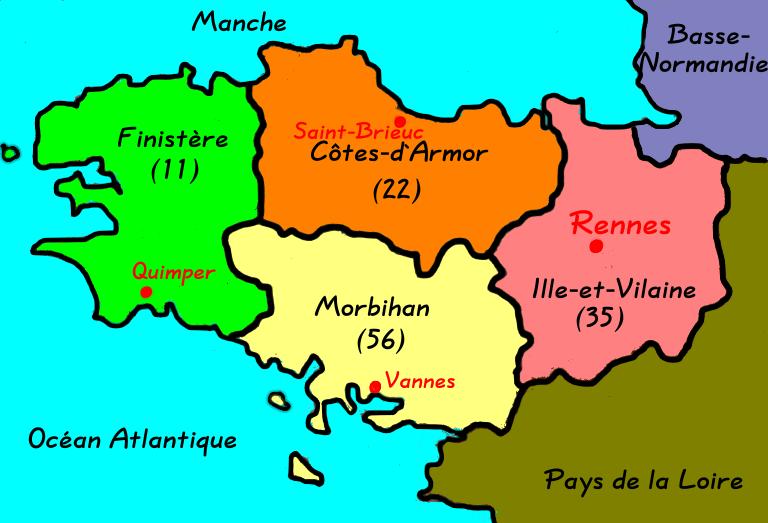 Les départements bretons. La Bretagne de nos jours est composée de quatre départements, le Finistère (29) "la fin de la terre" dans l'ouest, les Côtes d'Armor (22) (autrefois appelées Côtes du Nord) dans le nord, le Morbihan (56) dans le sud, et l'Ille et Vilaine (35) dans l'est. A ceux-ci s'ajoute - dans le cadre du territoire breton.