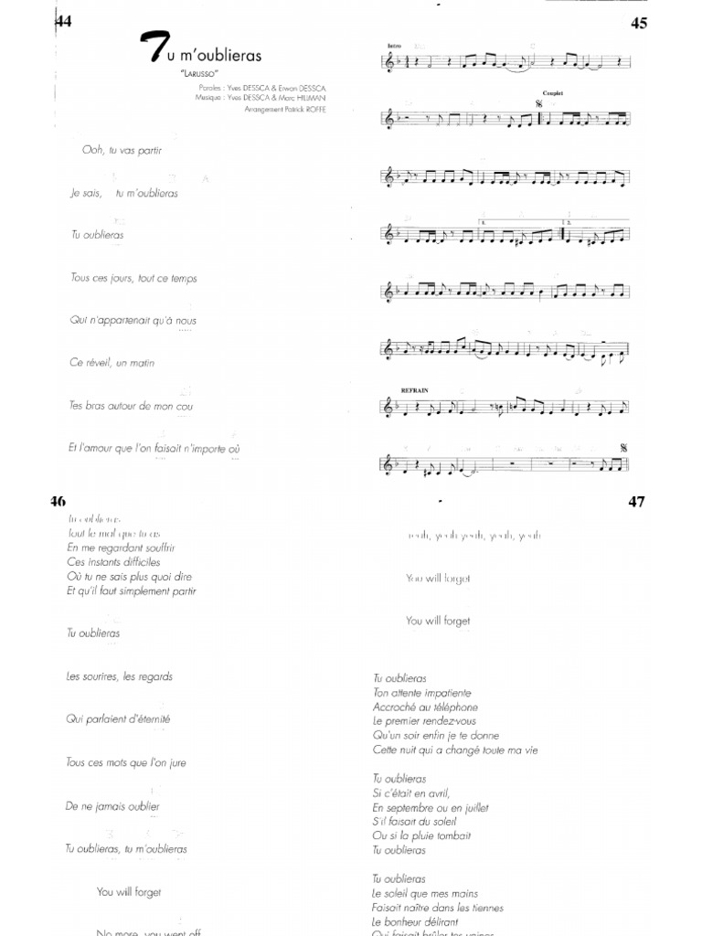 Tu oublieras. Tout ces jours, tout ce temps. Qui n'appartenait qu' nous. Ce rveil, un matin. Tes bras autour de mon cou. Et l'amour que l'on faisait n'importe o Tu oublieras. Tout le mal que tu as En me regardant souffrir. Ces instants difficiles. O tu ne sais plus quoi dire.