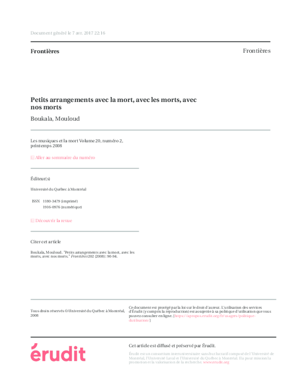 (PDF) Petits arrangements avec la mort, avec les morts, avec nos morts Mouloud Boukala