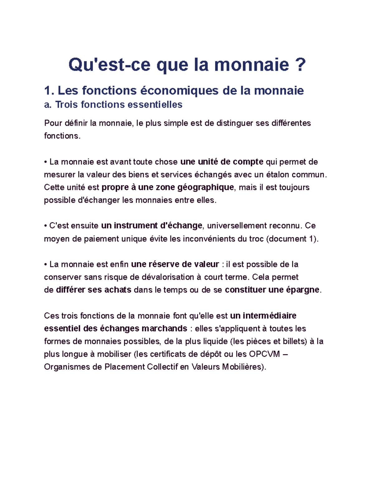 Qu'estce que la monnaie Les fonctions économiques de la monnaie a. Trois fonctions