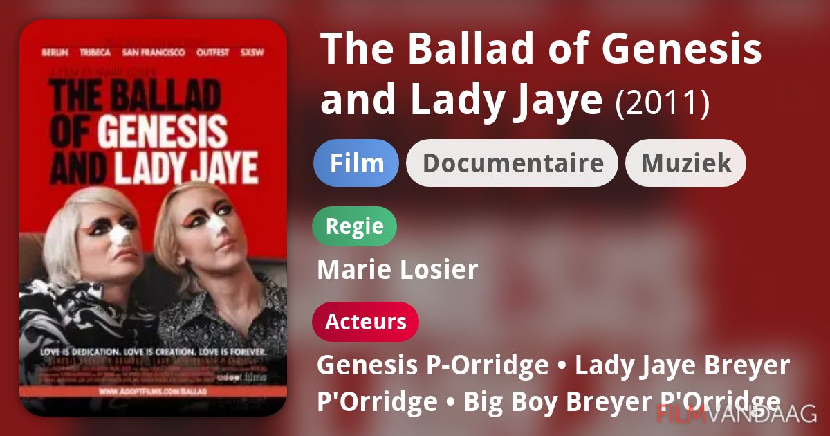 Released March 8th, 2012, 'The Ballad of Genesis and Lady Jaye' stars Genesis P-Orridge, Lady Jaye Breyer P'Orridge, Bryin Dall, William S. Burroughs The movie has a runtime of about 1 hr 12 min.